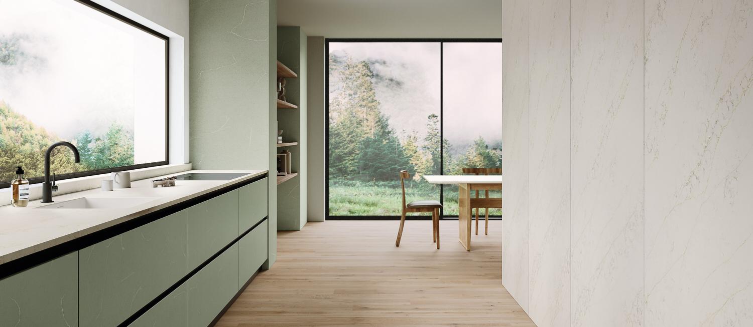 Зеленият цвят на Атлантида е мечтателен и неуловим. Ефимерно хроматично възприятие, предизвикващо светлинната прозрачност на морската вода. Разпръснат с малки контрастни точки, той е пресечен от фини светли вени, които създават фини и деликатни преплитания. Скъпоценна, елегантна плоча с отличителна привлекателност.