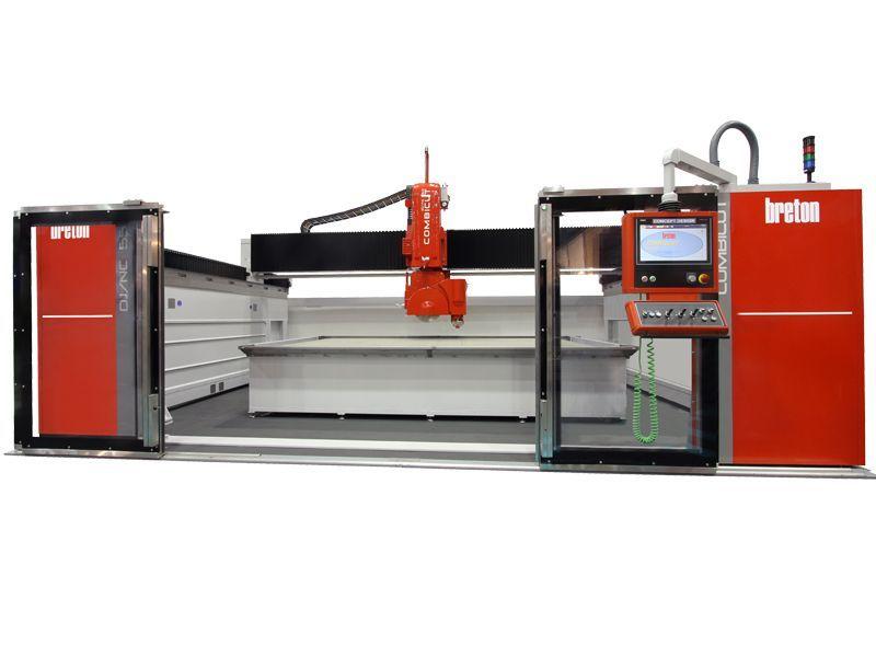 Breton Combicut is a digitallyrun machine. It has a spindle designed to mount a cutting wheel and waterjet, which rotates around its axis (4th axis) and can tilt from 0 to 55° (5th axis).